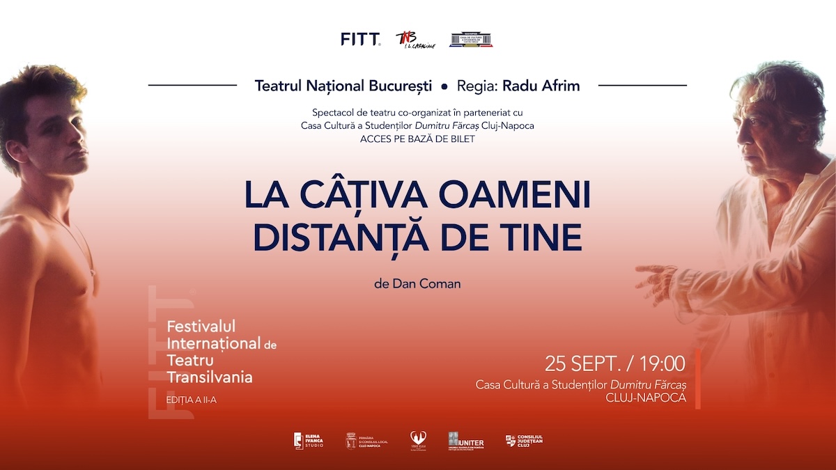 Publicul clujean va putea vedea pe scenă mari nume ale teatrului românesc și internațional. Unul dintre cele mai așteptate momente ale festivalului va fi spectacolul „La câțiva oameni distanță de tine”, scris de Dan Coman și regizat de inconfundabilul Radu Afrim. Considerat unul dintre cei mai talentați și sofisticați regizori europeni, dar și unul dintre cei mai controversați artiști ai scenei românești, Afrim este recunoscut pentru originalitatea și forța cu care zguduie tradițiile dramatice. De trei ori laureat al Premiului UNITER pentru cel mai bun regizor și distins cu Marele Premiu al Festivalului Grange de Dorigny din Lausanne (doi ani consecutivi), Afrim a câștigat și premiul „Coup de Coeur de la Presse” la Festivalul „Off” de la Avignon (2008). Stilul său unic – colorat, nonconformist, provocator, iubit de publicul tânăr – l-a impus ca un mare apărător al dramaturgiei contemporane. Producția adusă la FITT îi reunește pe Marius Manole și Marius Bodochi într-o radiografie tulburătoare a uneia dintre cele mai dureroase realități ale prezentului – migrația –, dar și a fragilității relațiilor dintre părinți și copii. Afrim creează, prin felul său inconfundabil de a construi lumi teatrale, o poveste emoționantă despre singurătate și dragoste, adevăr și minciună, despre cât de aproape sau cât de departe suntem unii de ceilalți.