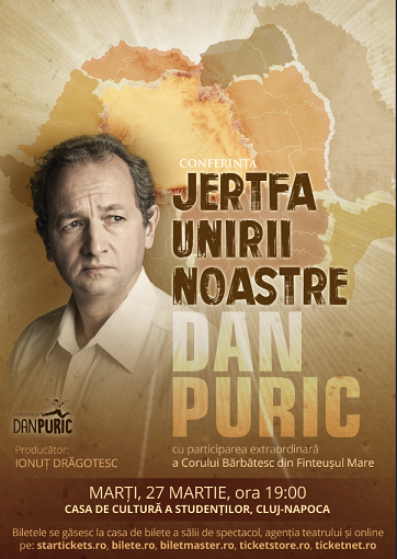 Dan Puric va susține la Cluj-Napoca o conferință intitulată JERTFA UNIRII NOASTRE. Evenimentul va avea loc la Casa de Cultură a Studenților, în data de 27 martie, de la ora 19.