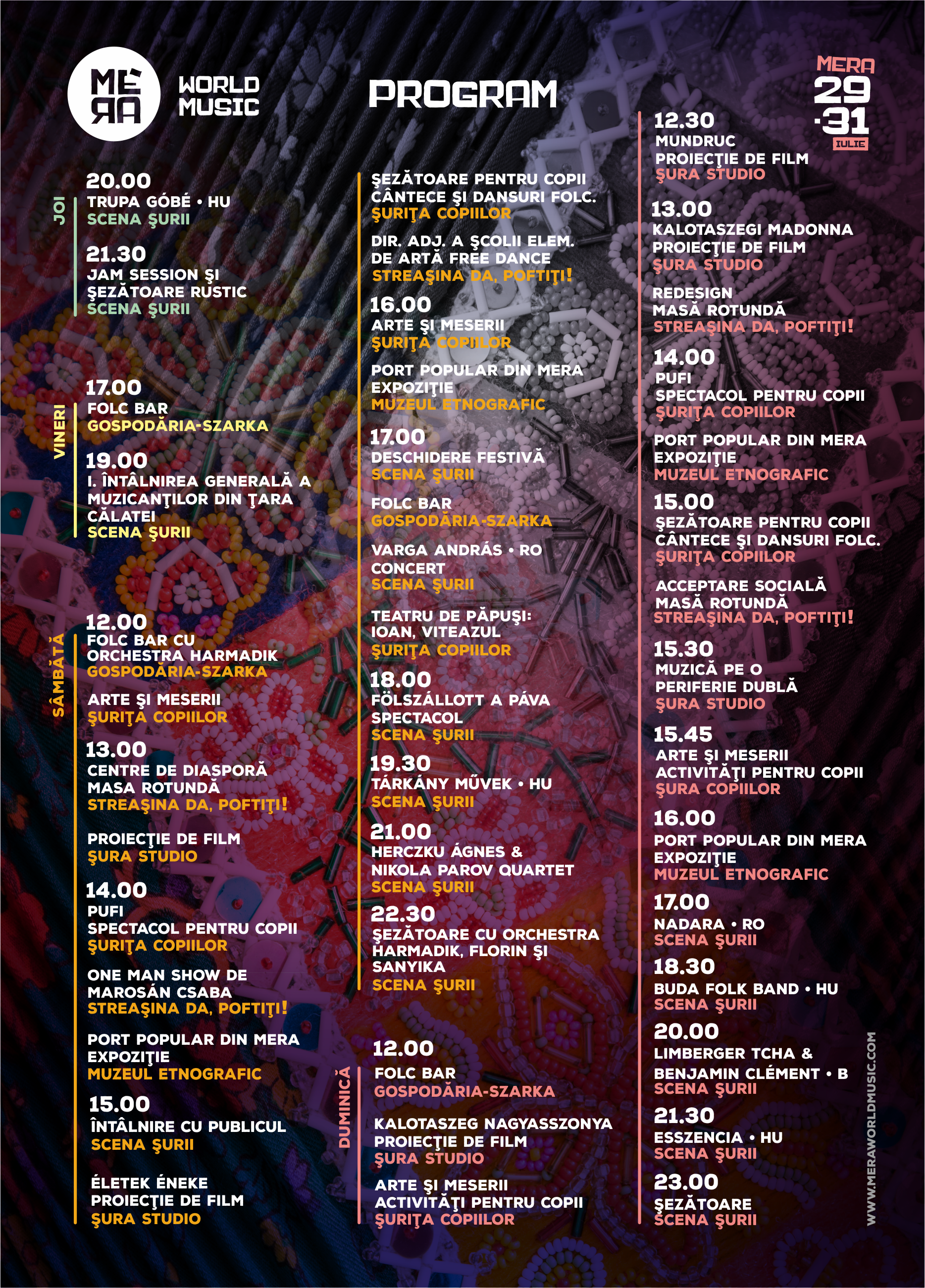 Începând de sâmbătă, programul cuprinde proiecții de filme documentare și alte specialități în Șura Studio, mese rotunde cu organizarea asociației “Da, poftiți!”, programe pentru copii la Șurița Copiilor, expoziții, iar înaintea concertelor va avea loc întâlnirea artiștilor cu publicul. Barul folk va asigura mâncarea caldă, băuturile reci și muzica bună.