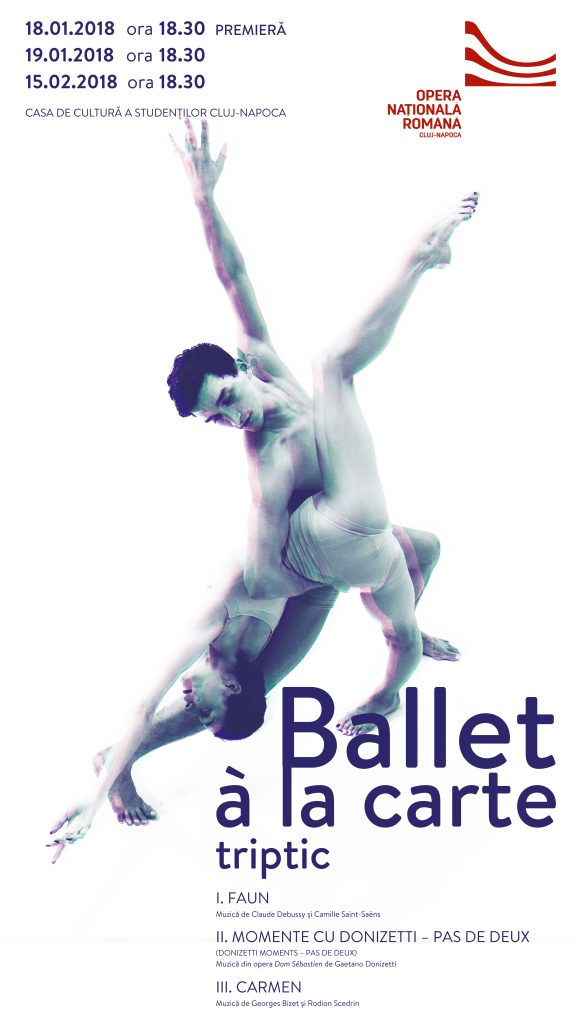 Opera Națională Română din Cluj-Napoca are plăcerea de a vă invita joi, 18 ianuarie 2018, ora 18:30, la cea dintâi premieră a anului ”BALLET À LA CARTE”. Pus în scenă la Casa de Cultură a Studenților, evenimentul anunță o premieră națională de excepție, precum și începutul unei colaborări între cele două instituții de cultură clujene ce conferă teatrului nostru liric posibilitatea de a monta, la cererea publicului, un număr mai mare de evenimente, pe o scenă alternativă deschisă spectatorilor de toate vârstele.