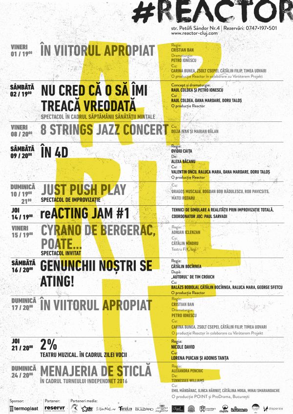 În aprilie la Reactor diversitate e cuvântul cheie: spectacole proprii, spectacole invitate, teatru muzical, jazz. improvizații de toate felurile, totul reflectă dinamismul primăverii care își intră încet-încet în drepturi.Atât pe scenă, cât și în spatele ei, lucrurile se precipită, se pornesc proiecte, se primesc musafiri și se reactivează, în general, cu mai mult spor și poftă.