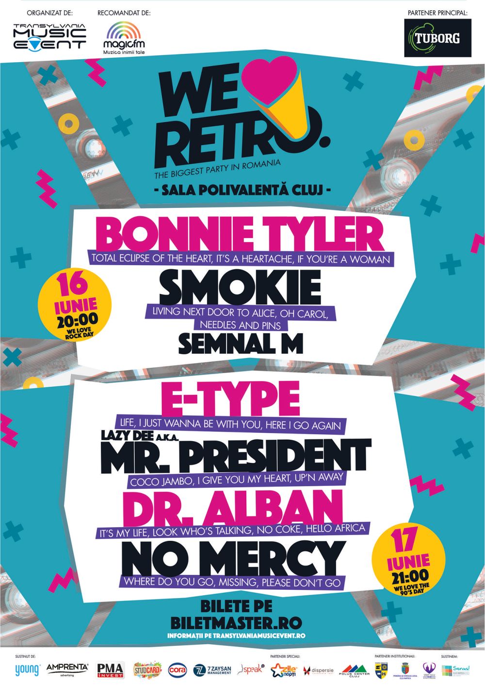 Bonnie Tyler, Smokie, Mr. President, Dr. Alban, No Mercy și E-Type vor concerta în această vară la Cluj-Napoca! Luna iunie va fi gazda artiștilor care au definit muzica anilor ’80 și ’90. Pe 16 și 17 Iunie 2016 generația celor de 25-45 de ani va avea ocazia să își reamintească de probabil cea mai frumoasă perioadă a vieții: de vremea primelor discoteci, a casetofoanelor cu luminițe și a petrecerilor cu colegii de școală. Atmosfera celor mai marcanți ani din istoria recentă a României va fi recreată în detaliu prin decoruri speciale la ”We Love Retro”.